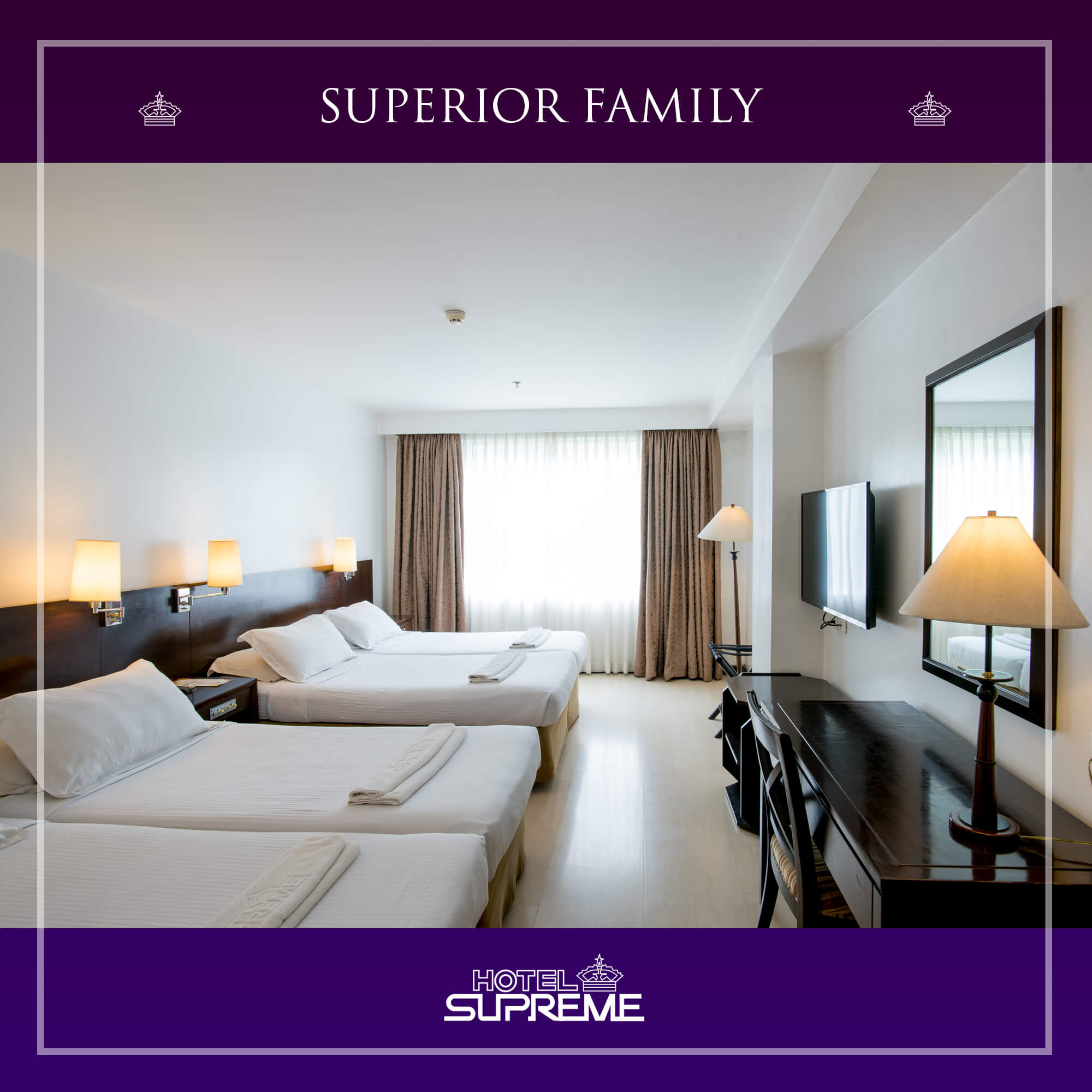Superior Family NOTE: THIS ROOM IS NOT EQUIPPED WITH AN AC UNIT Details Guests: 4 Categories: Convention Plaza Prices start at: ₱3,200 per night Availability Reservation Form Required fields are followed by * Check-in Date * Check-out Date * Reserve 1 of 1 available accommodations. Superior Family is available for selected dates.